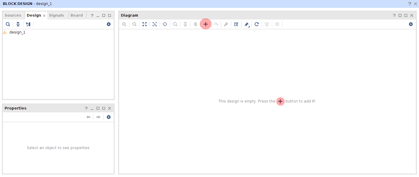 This creates a blank design, so we can now start adding “IP Cores”. IP Cores are pre-made components that can be used like Lego blocks to build a system quickly.
