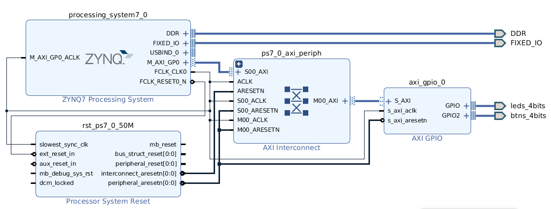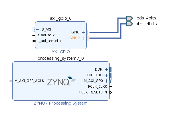 M_AXI_GP0) and the GPIO core’s slave port (S_AXI) are connected together through the AXI Interconnect.