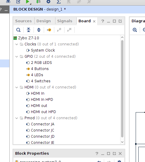 However, as you can see, while the GPIO core is in our design and is connected to the LED and Button inputs and outputs, it is not actually connected to the CPU (the Zynq block). We will address that now.