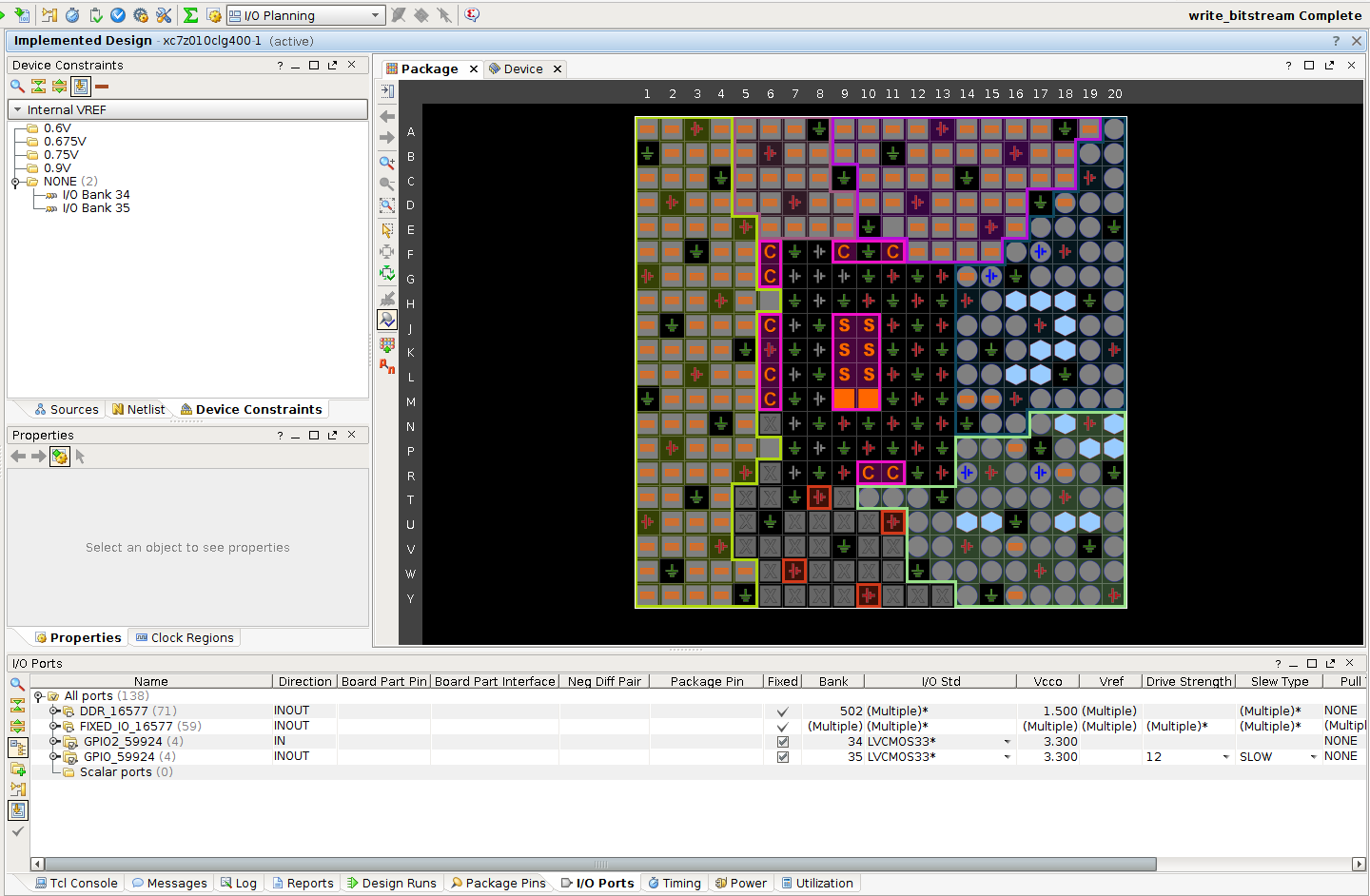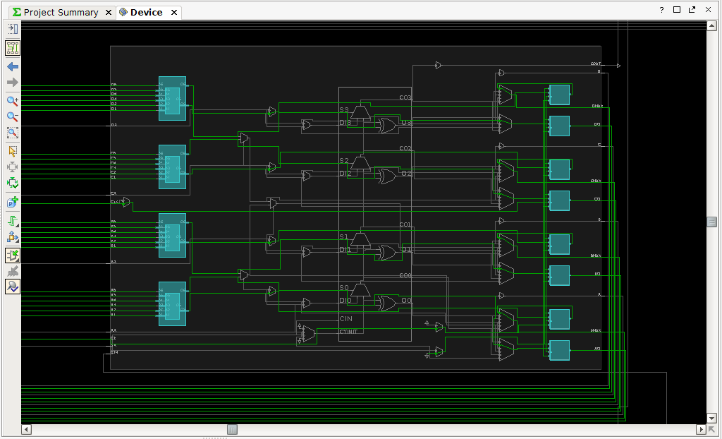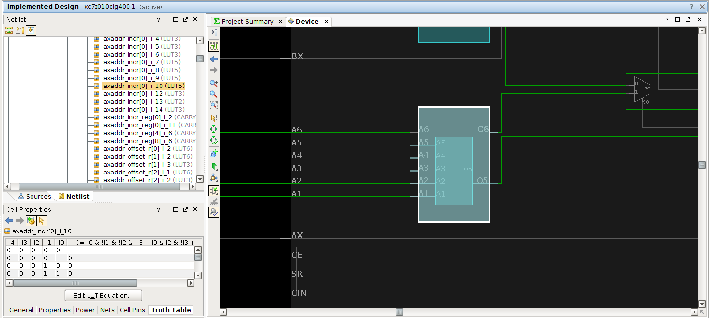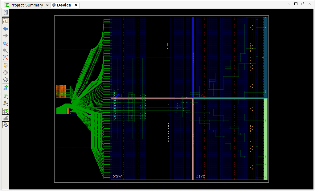 The Device view shows the layout of your design in terms of FPGA logic – the look-up tables (LUTs), multiplexors (MUXs), etc. that the device is made up of. The things on the left of the first image below are the ARM cores and external memory connections, and the parts inside the blue boxes show your (currently very small) design routed onto the FPGA logic