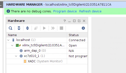 At this point you should grab an FPGA board and connect it via USB to your computer. In the Flow Navigator click “Open Hardware Manager”, then “Open Target” and “Open New Target”. You should see following description of the connected FPGA: