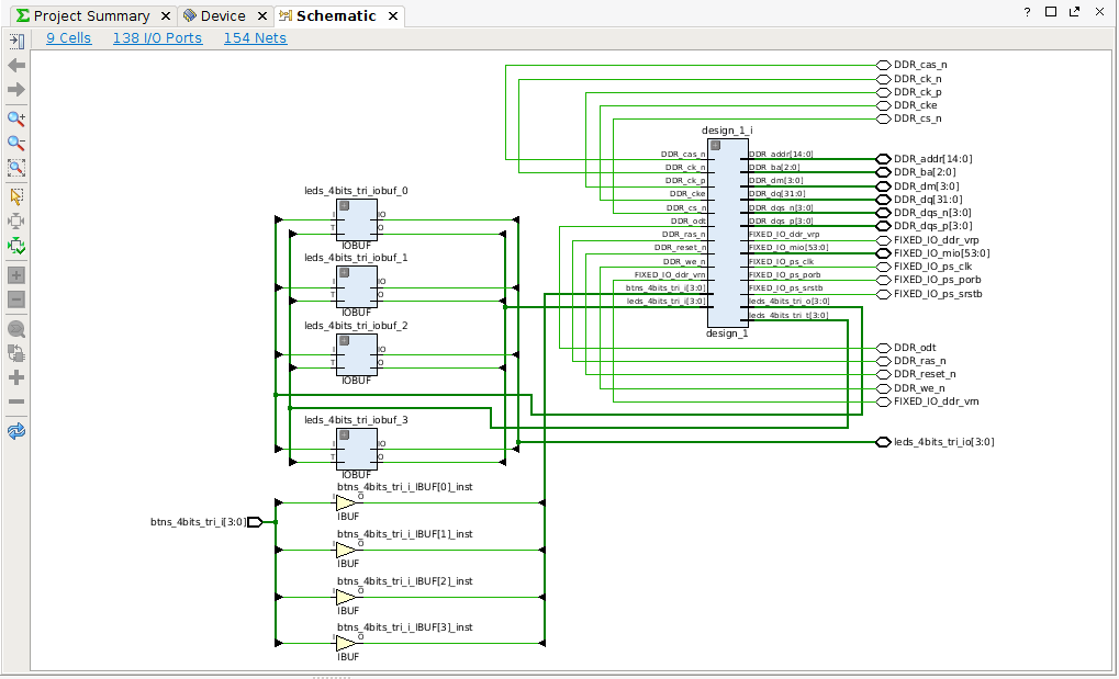 If you’re curious, you can also explore a logical schematic of your design as generated by the synthesis process, by choosing “Open Synthesized Design” then “Schematic” in the Flow Navigator.