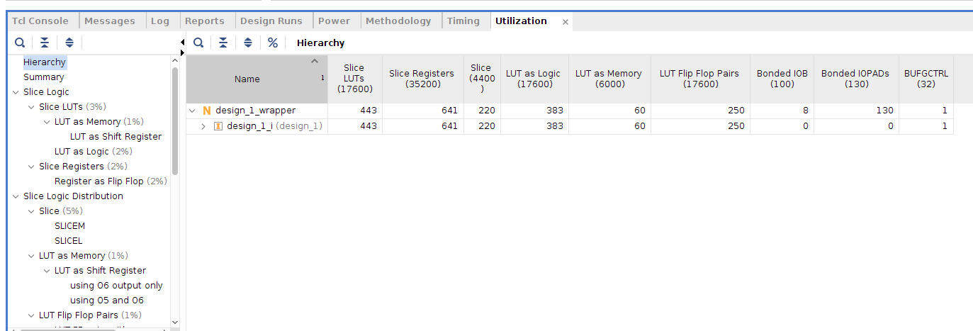 You can also view various reports (e.g. timing, power and utilisation) using the options in the flow navigator. This can be useful to see how much space your design is using on the FPGA fabric. Clicking “Report Utilization” brings up a summary of how your design fits on the device.
