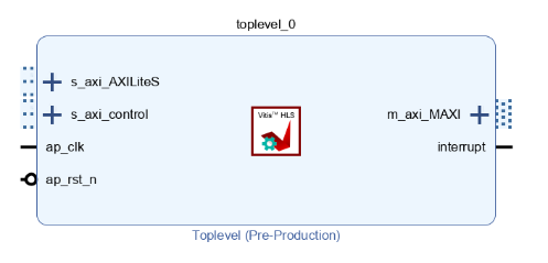 The file also contains pragmas which are called directives by HLS. Directives are used to tell HLS how to make your hardware. The directives here tell HLS to create an AXI Master interface, and AXI Slave interfaces. This is all described in the knowledge base. The Master interface allows the component to access main memory, and the slave interface allows the ARM cores to pass in a few variables and to start, reset, and stop the component. Once built and exported, your component will look like this in Vivado:
