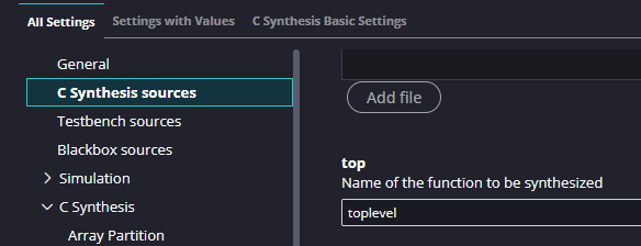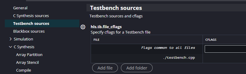Before we can run the testbench we have to set it as a valid test bench. “But hang on!” I hear you ask. “Didn’t we already add it into a folder called Test Bench?” Well yes we did, but Xilinx. Anyway, go to Settings -> hls_config.cfg -> Testbench Sources and Add File to add it.