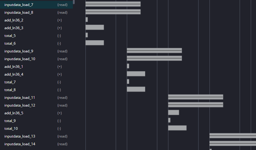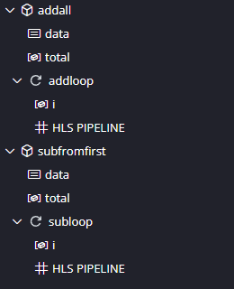 The green boxes are our pipelined loops. By clicking toplevel_Pipeline_subloop we see that it depends on total so a data dependency means that the two loops aren’t happening at the same time (they would be stacked on top of each other if they were). Instead, the speed boost comes from the fact that data items are pushed into the loops faster.