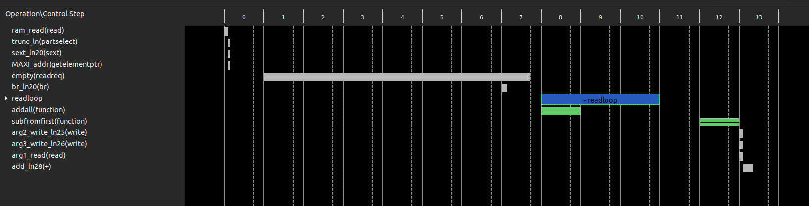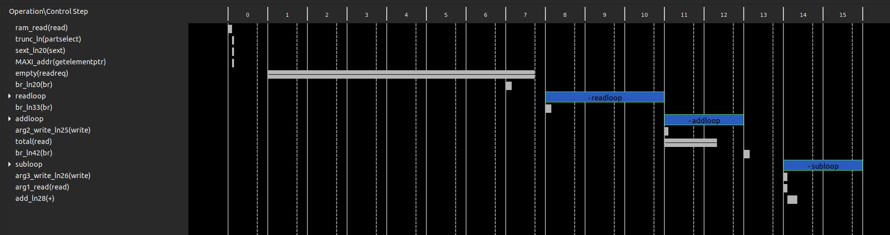 The rows are operations that come from your compiled code. The columns are states, and so looking vertically shows all the things that are happening in parallel. If two things are in the same column, they happen in parallel. Currently we can see that the addloop and subloop loops do not overlap, so they are not done in parallel. Note also that addloop and subloop have two states. This corresponds to the Performance Estimates we got from the synthesis report that told us the iteration latency of both these loops is two.