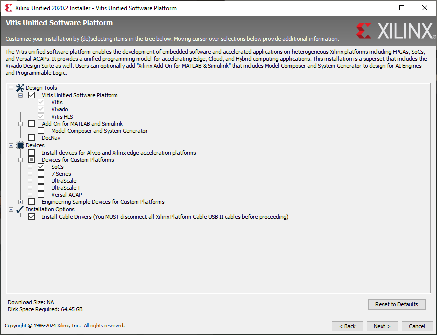 ./FPGAs_AdaptiveSoCs_Unified_SDI_2025.2_1114_2157_Lin64.binFor EMBS, you need to install Vitis, Vivado, (Vitis HLS if this is a separate option), and to Install Cable Drivers. Under “Devices” turn on support for all the types of FPGAs that you will be using. For the Zybo in EMBS just turn on “SoCs”. Depending on the exact version you are installing it will look something like this: