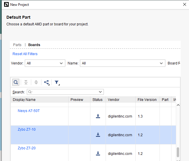 If you are using a Zybo board (e.g. for EMBS) you will also need to install the Digilent board definition files. To do this, in the New Project wizard you will get to the “Default Part” page. Select Boards, and Refresh, to download the catalogue of boards from Xilinx. Find the Zybo Z7-10 board and click the install button (the downwards arrow in the Status column).