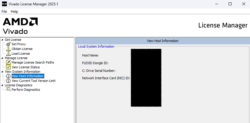 You can then add the Vitis HLS License product (and any other products that you wish). Because the licence is going to be locked to one computer, you will be asked for host information. Back in the Xilinx License Manager you can select ‘View Host Information’ to see your Host Name, the serial number of your main disk drive, and the ID of your network interface.